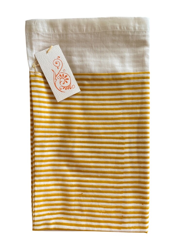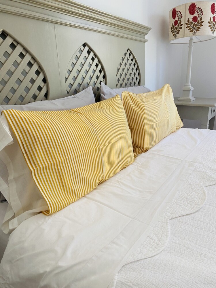 Each pillowcase is made from fine cotton voile, known for its soft, breathable texture. The mustard and white stripes are hand block printed, giving every set a unique, natural finish. Inside, each pillowcase is lined with soft white voile for extra durability and a smooth, cool feel against your skin.