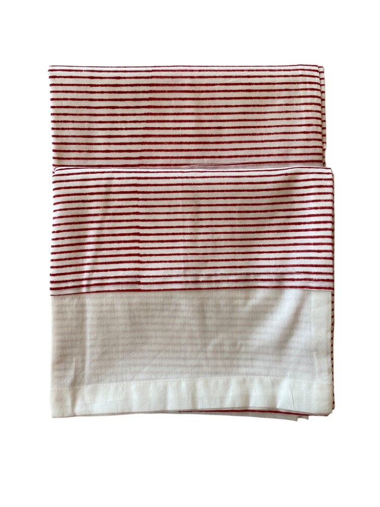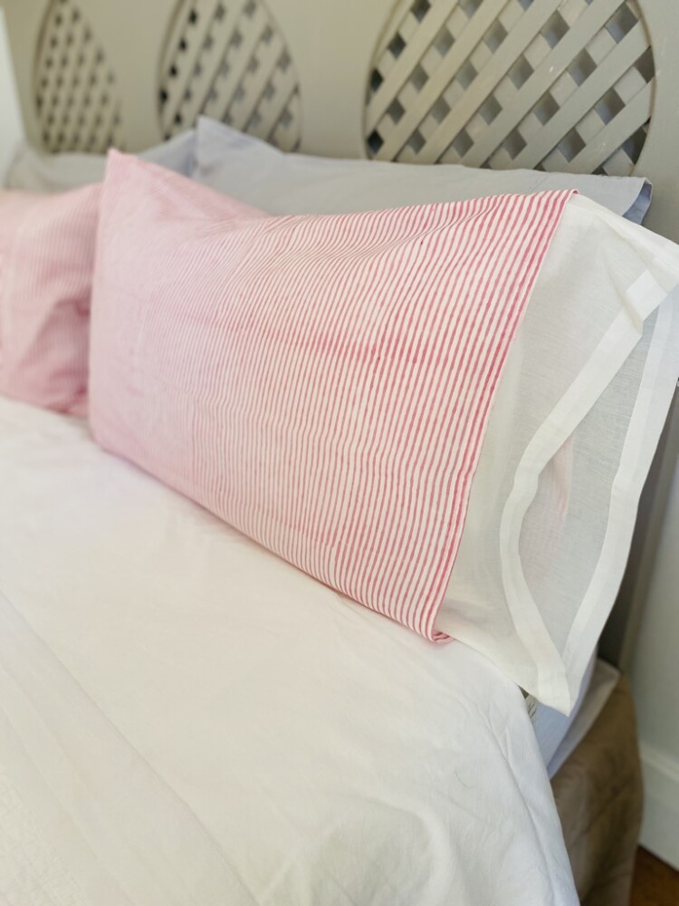 Each pillowcase is made from fine cotton voile, a lightweight fabric known for its soft texture and breathability. The delicate pink and white stripes are hand block printed, giving each piece a unique, artisanal character. Inside, a soft white voile lining adds structure and a smooth finish while keeping the pillowcases cool and airy.
