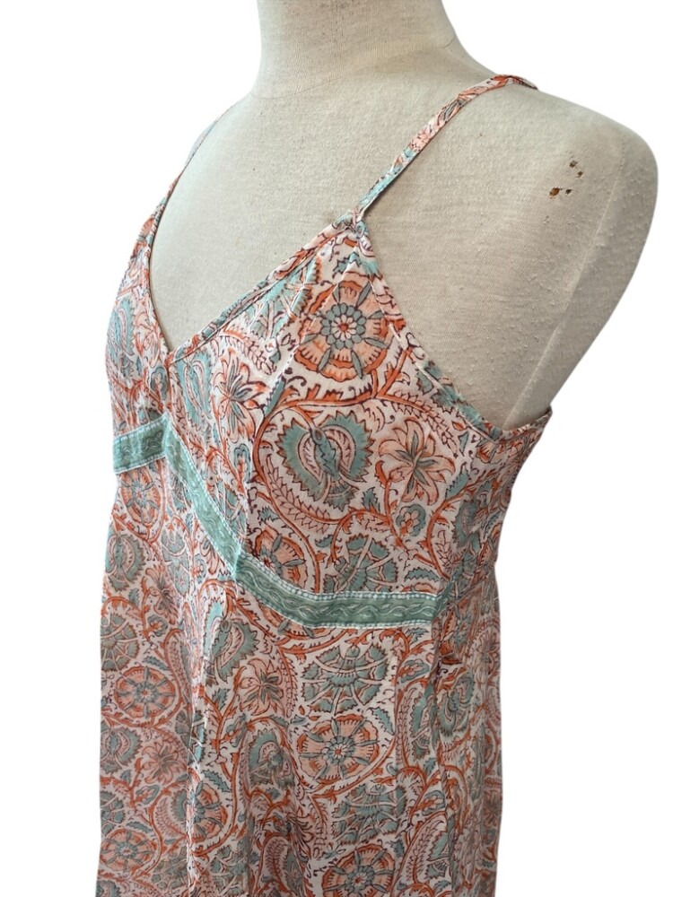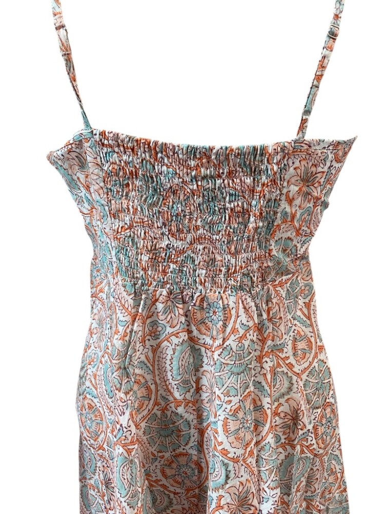 Crafted from soft, hand-block printed cotton, the fabric feels gentle on your skin and keeps you cool. The floral design in soft peach and aqua tones brings a feminine and refreshing touch. Each print is hand-finished by skilled artisans in India, making every piece unique.