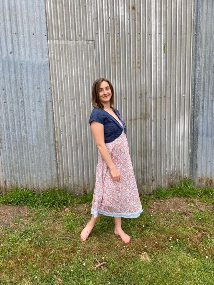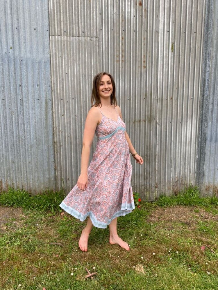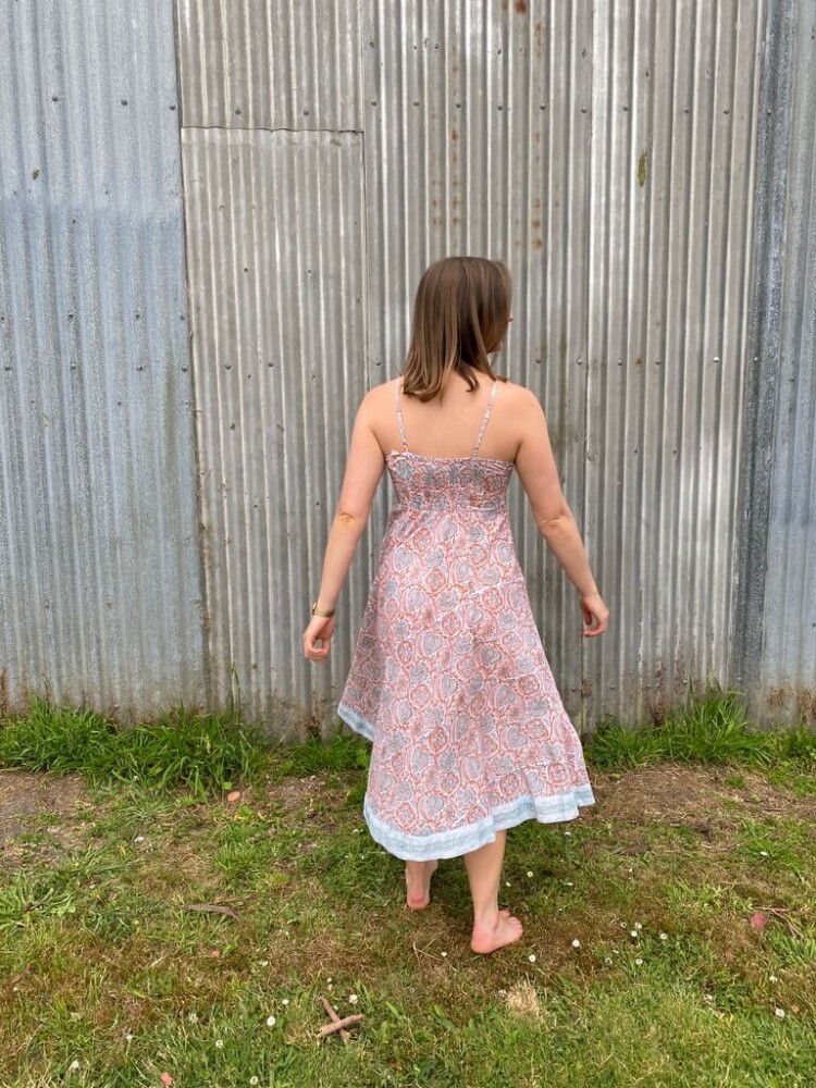The A-line cut creates a graceful drape that flatters all shapes, while the adjustable straps ensure a comfortable and custom fit. A contrasting border and under-bust trim add thoughtful detailing, giving the dress a refined finish. Lightweight and unlined, it layers beautifully with a wrap or denim jacket when the weather cools.