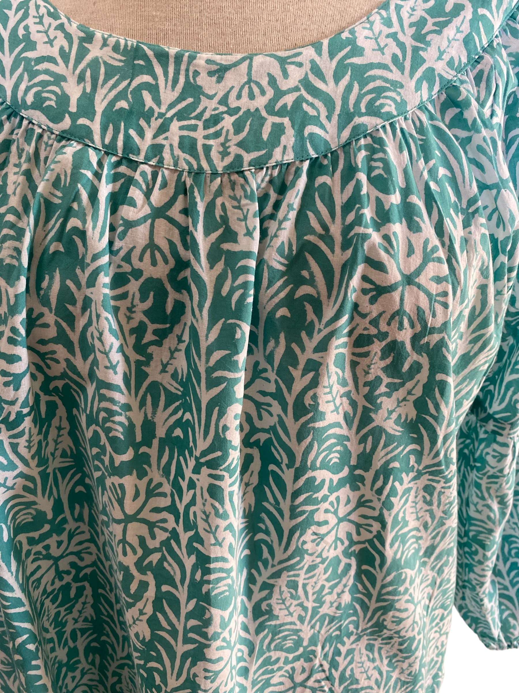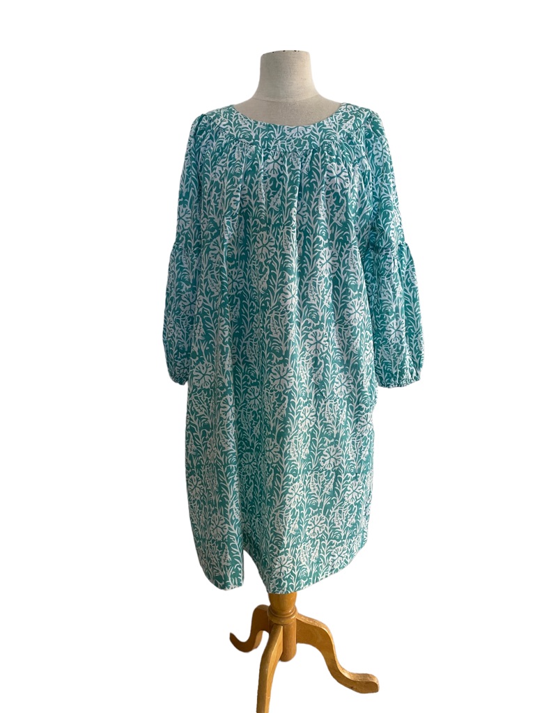 Our Timeless Cotton Block Printed Peasant Style Midi Dress in Turquoise offers Modern Functionality but still has a Classic Boho Charm, it features side Pockets, Long slightly gathered sleeves and soft Elastic at the Wrist.