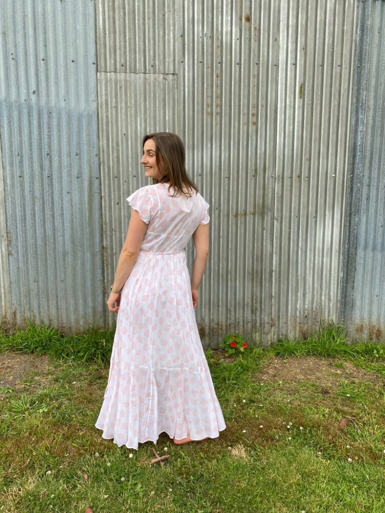 This dress is made from 100% pure cotton, known for its breathability and natural comfort. Each piece is hand block printed in India by skilled artisans using age-old techniques. The delicate peach motif stands out against the soft cream background, creating a design that feels both modern and timeless.